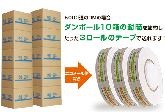 5000通のDMの場合、「エコメール便」ならダンボール10箱の封筒を節約し、たった3ロールのテープで送れます。